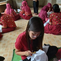 At 8:20 am we go to batik house near the school using the school's bus with Mrs. Dewi and the whole class, then listen to the history of batik and try to do it. I help the students to do their design pattern . I made batik with the students, at first it's kind of hard to trace the drawings. The procedure of doing batik is time consuming but very entertaining as I heard my students laugh and see them smiling while talking. Doing batik is very fascinating for me, especially when I saw the finish product.